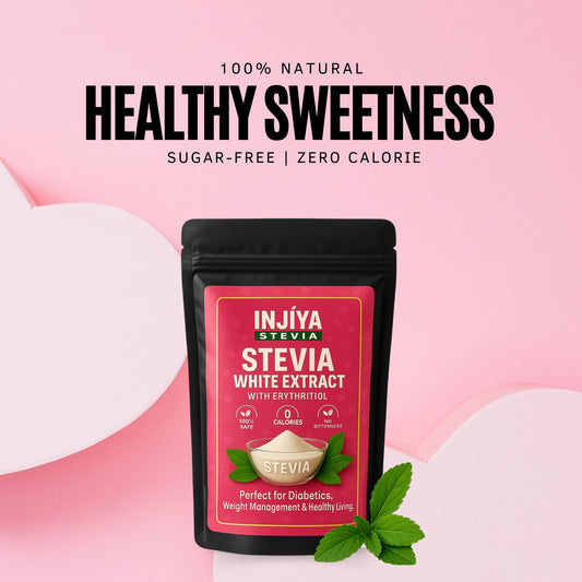 INJIYA STEVIA — A zero-calorie, diabetic-friendly sweetener made from pure Stevia leaves. No bitterness. No chemicals. Perfect for daily use.