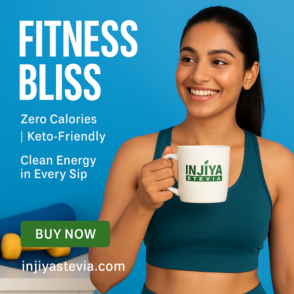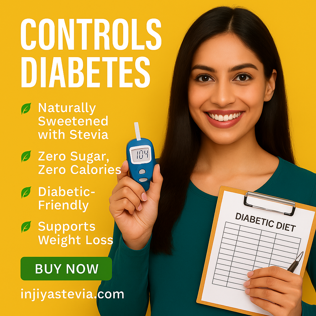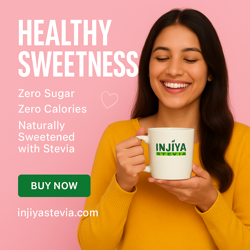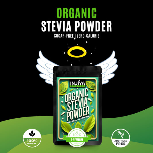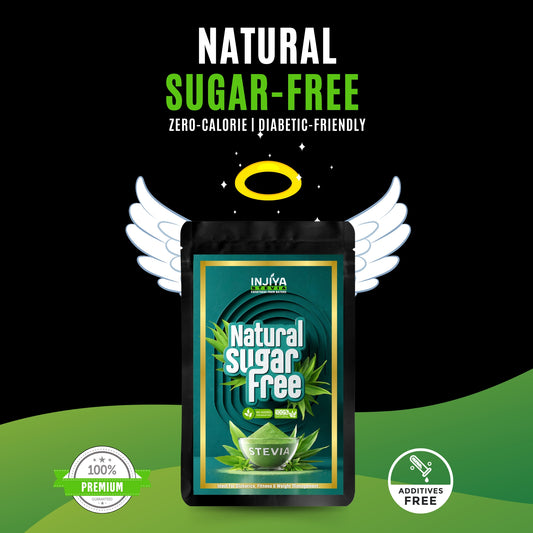 INJIYA STEVIA — A zero-calorie, diabetic-friendly sweetener made from pure Stevia leaves. No bitterness. No chemicals. Perfect for daily use.